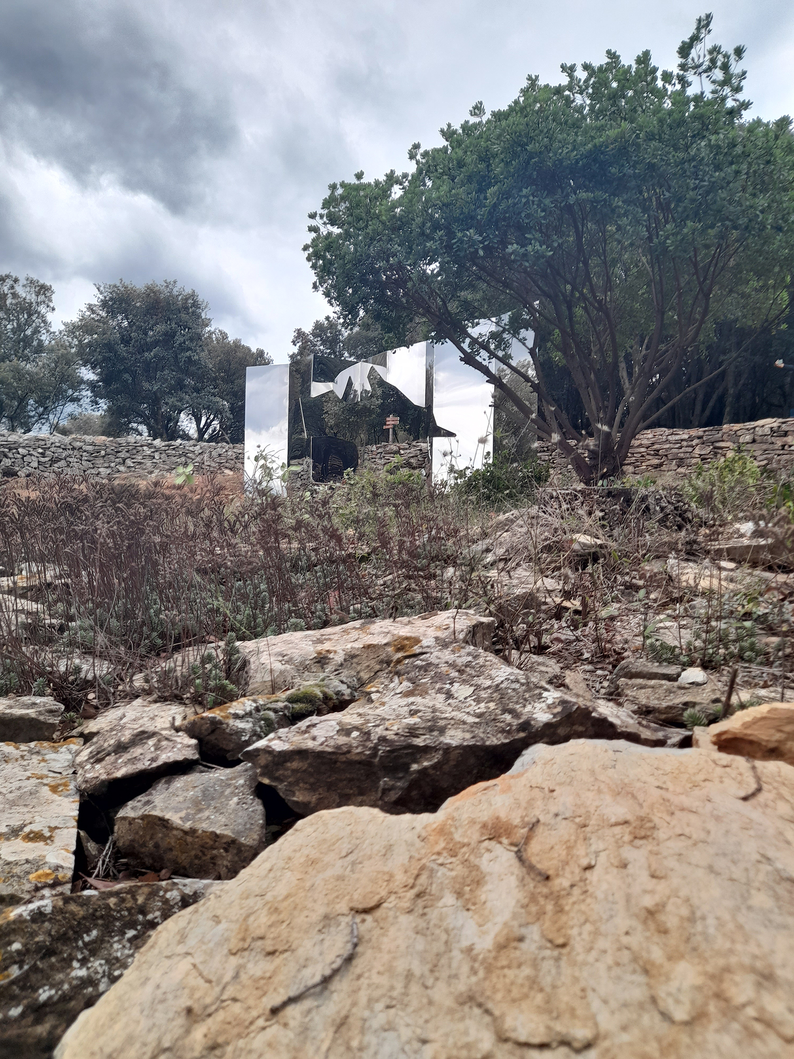 L’œuvre « À Voix basse » de l’artiste sétois Jean Denant est comme un grand paravent aux deux faces réfléchissantes de 3 mètres de haut sur 7 mètres de long. Posée en pleine nature, elle est percée d’une forme d’apparence abstraite alors qu’il s’agit du dessin cadastral de la parcelle des Mates basses : la cartographie est un élément récurrent dans l’œuvre de Jean Denant, telle la mappemonde ou la Méditerranée. Cette œuvre par ses pans différemment orientés et sa trouée a quelque chose d’un kaléidoscope qui multiplie et par là célèbre ce paysage en offrant à la fois la face et le dos, l’ocre de la terre, le végétal et le ciel, l’ombre et la lumière. »